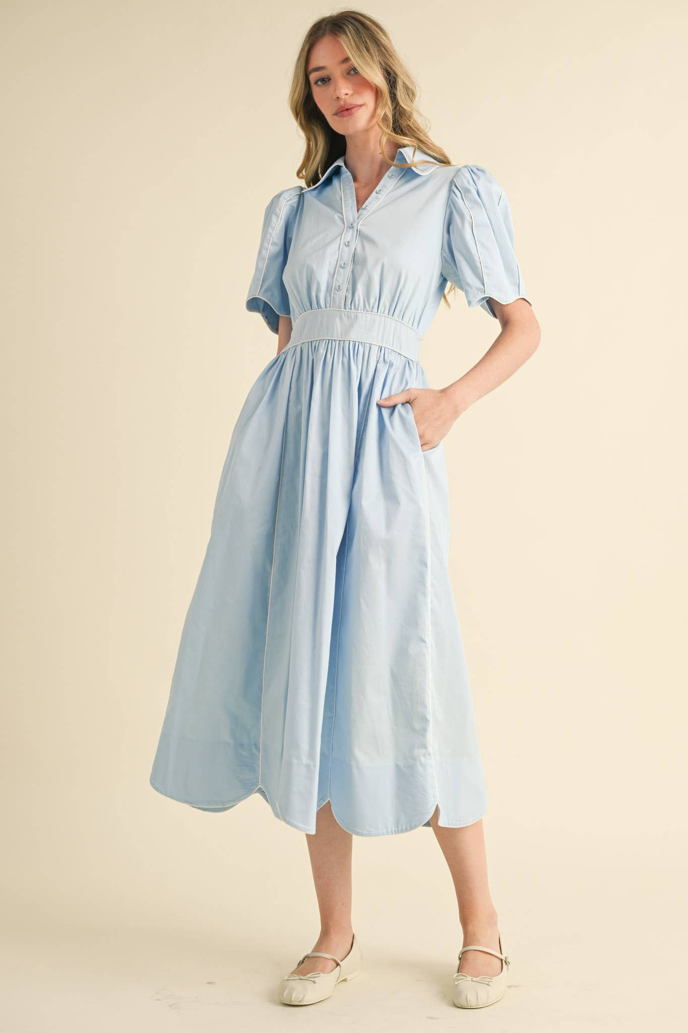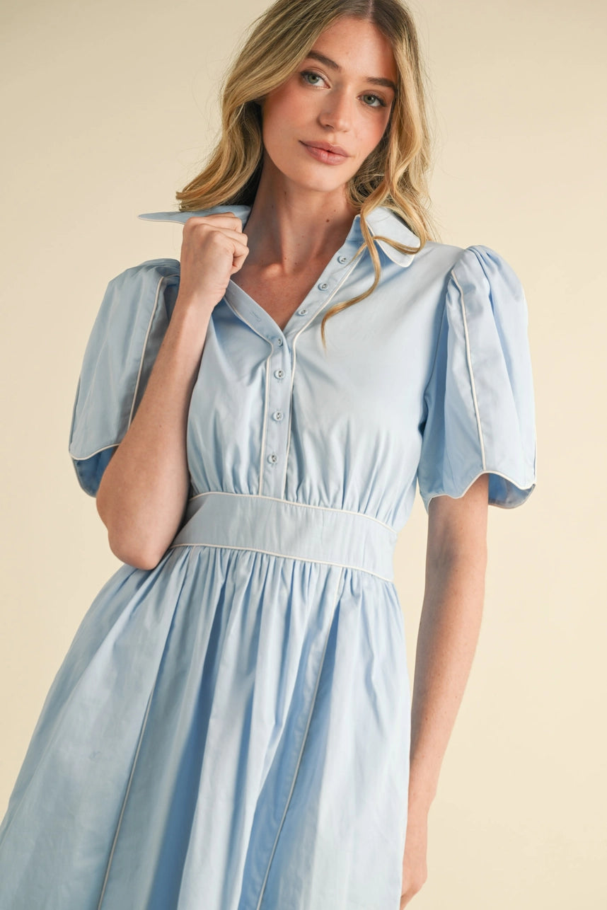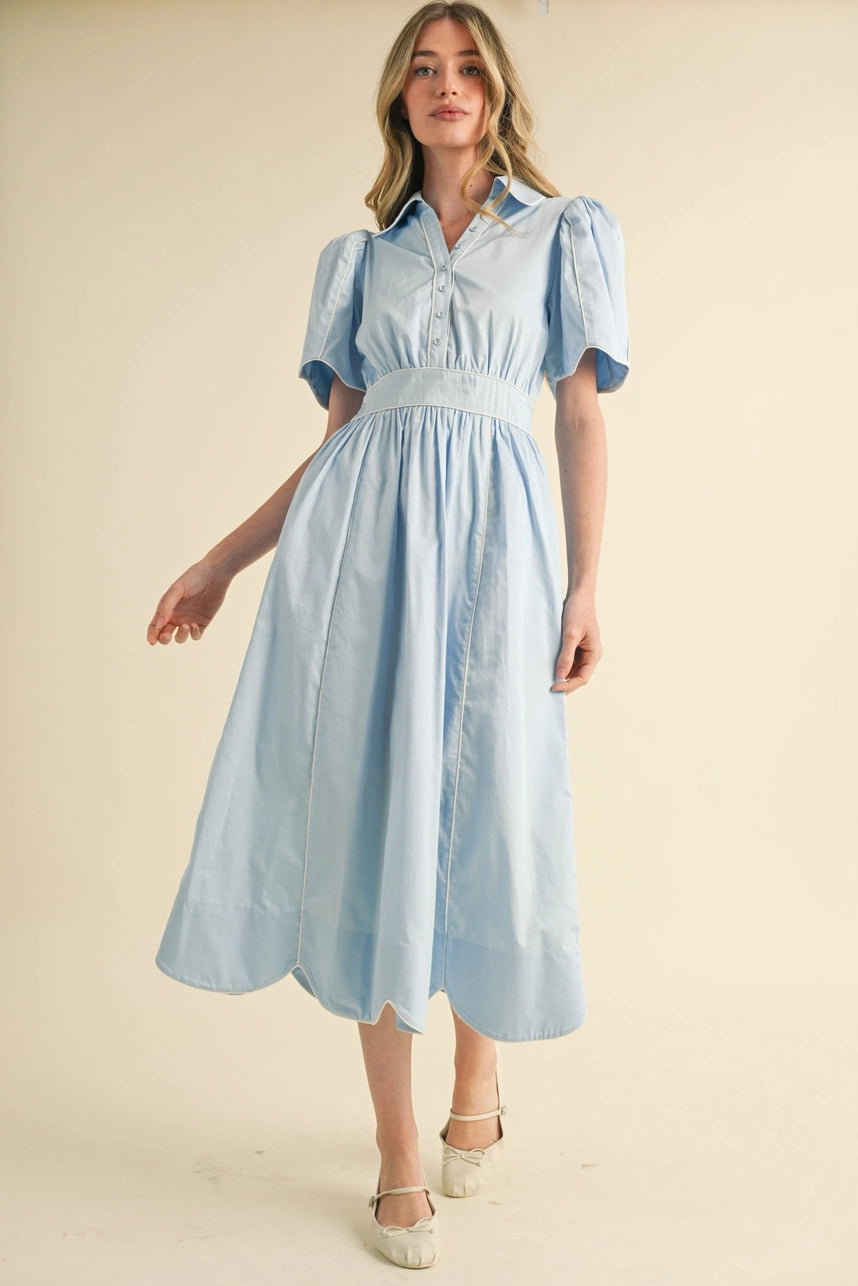 Spend the sunny days looking stunning in this scalloped button down midi dress! Lightweight woven fabric shapes short puff sleeves that frame a gathered fitted bodice with a collared neckline. Button placket accents the front, ending at a fitted waist with smocked elastic at the back, and continues down to an A-line skirt with a gorgeous scalloped midi hem. Contrast piping detail adds a modern and feminine accent throughout the dress.